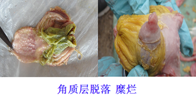 谷鳳柱教授還說(shuō),肌胃炎多和腺胃炎同時(shí)發(fā)生,但也可單獨(dú)發(fā)生,且對(duì)雞的危害大于腺胃炎。由于病因不同,臨床肌胃角質(zhì)層的病理變化也不盡相同。臨床上經(jīng)??吹郊∥附琴|(zhì)層的糜爛、崩解一定是發(fā)生了肌胃炎,但角質(zhì)層沒(méi)有糜爛不一定不是肌胃炎,要認(rèn)真辯證分析。如果發(fā)現(xiàn)角質(zhì)層已經(jīng)發(fā)生褪色、變淡,那么我們就應(yīng)該注意了。