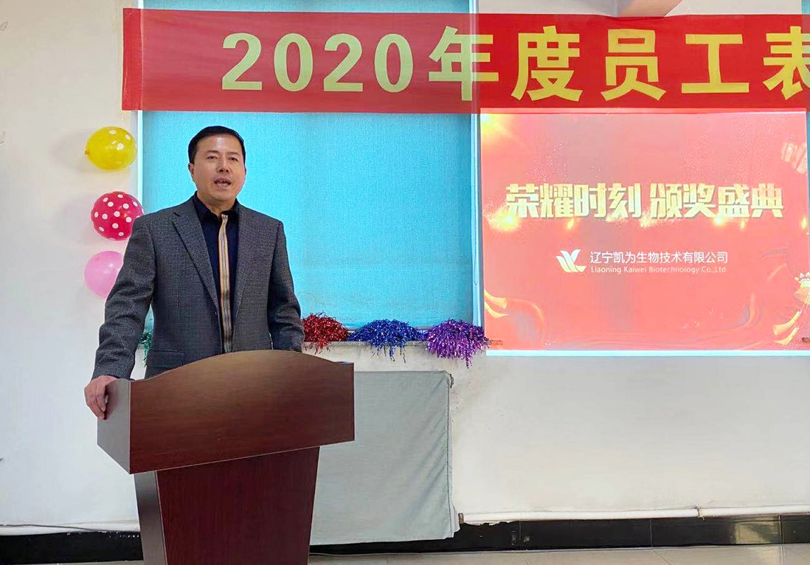 2021年1月9日,遼寧凱為生物技術有限公司2020年員工表彰大會于公司總部會議室成功召開,公司各級領導及全體員工應邀參會。表彰大會首先由公司總經理王鐵良致2021年新年賀詞,隨后分別頒發(fā)了生產部優(yōu)秀員工獎、六年貢獻獎、十年貢獻獎和行政優(yōu)秀員工獎四個獎項。